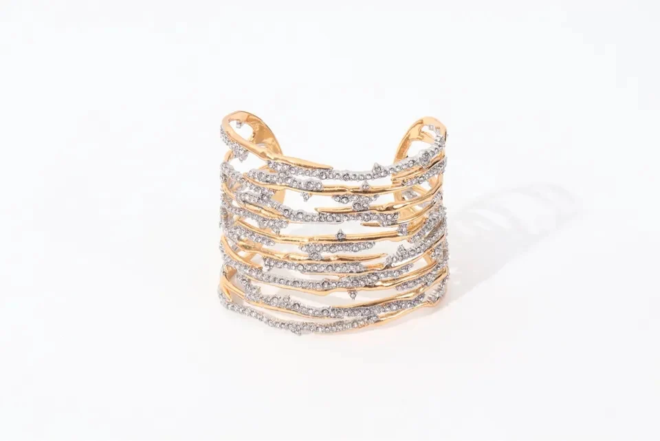 - Cuff bracelet adorned with dazzling zirconia diamonds over a striped pattern.