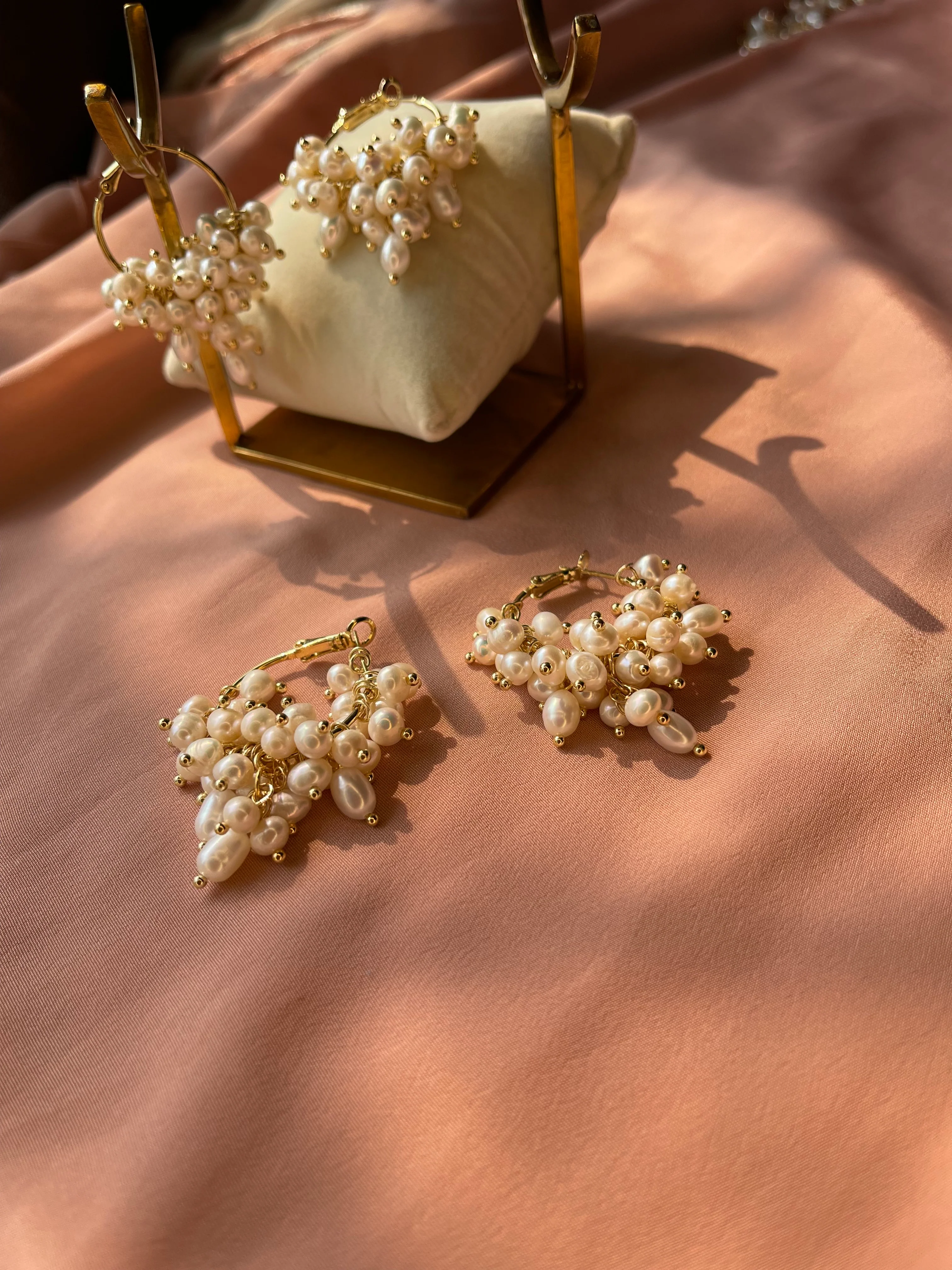 Our NOORZIA PEARL BAALIS are the desi version of classic golden hoops. The soft sheen on pearls with golden details, compliment the entire look so well.